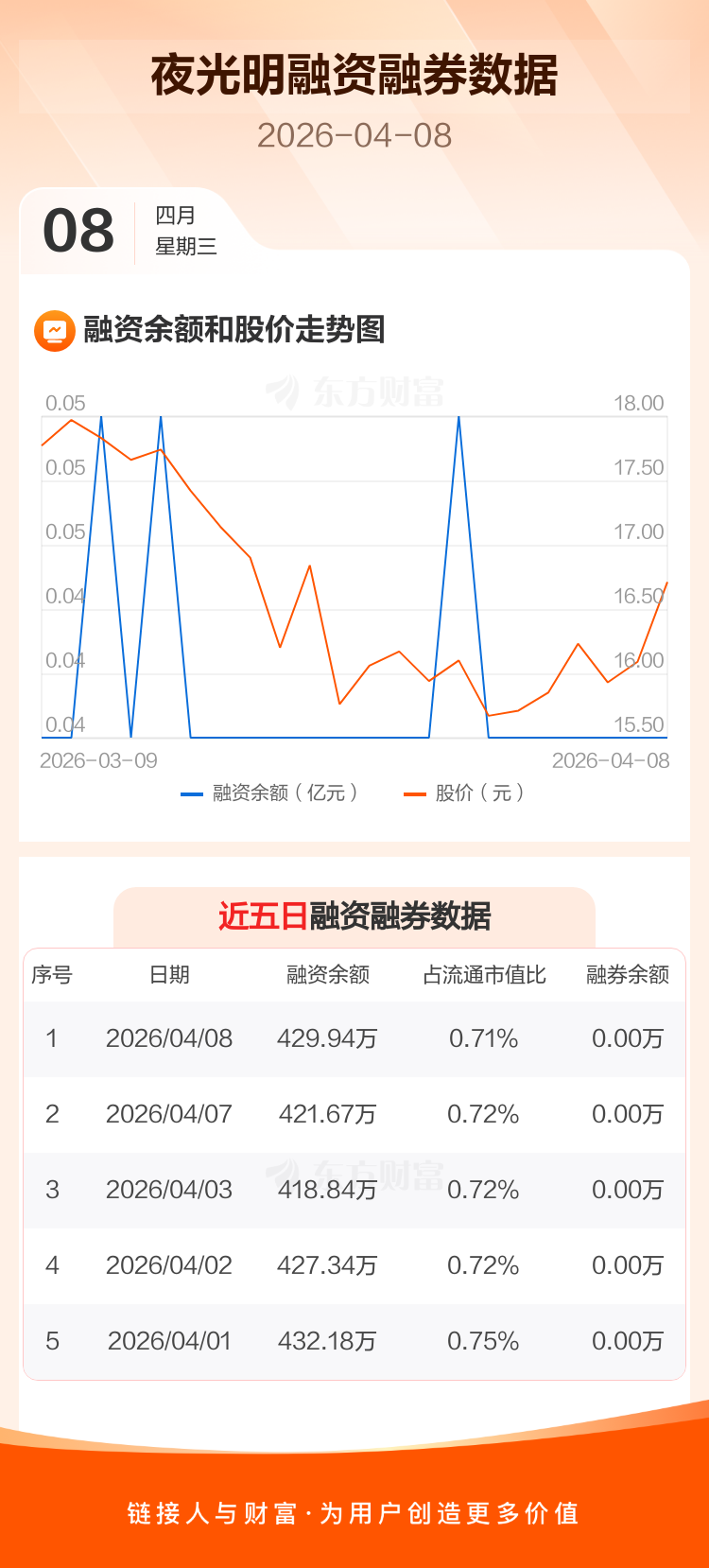 交易所最新数据显示,夜光明于2026年4月8日获融资买入14.56万元,融资偿还6.29万元,当日融资净买入8.27万元。目前,该股融资余额429.95万,占流通市值比例为0.71%。
