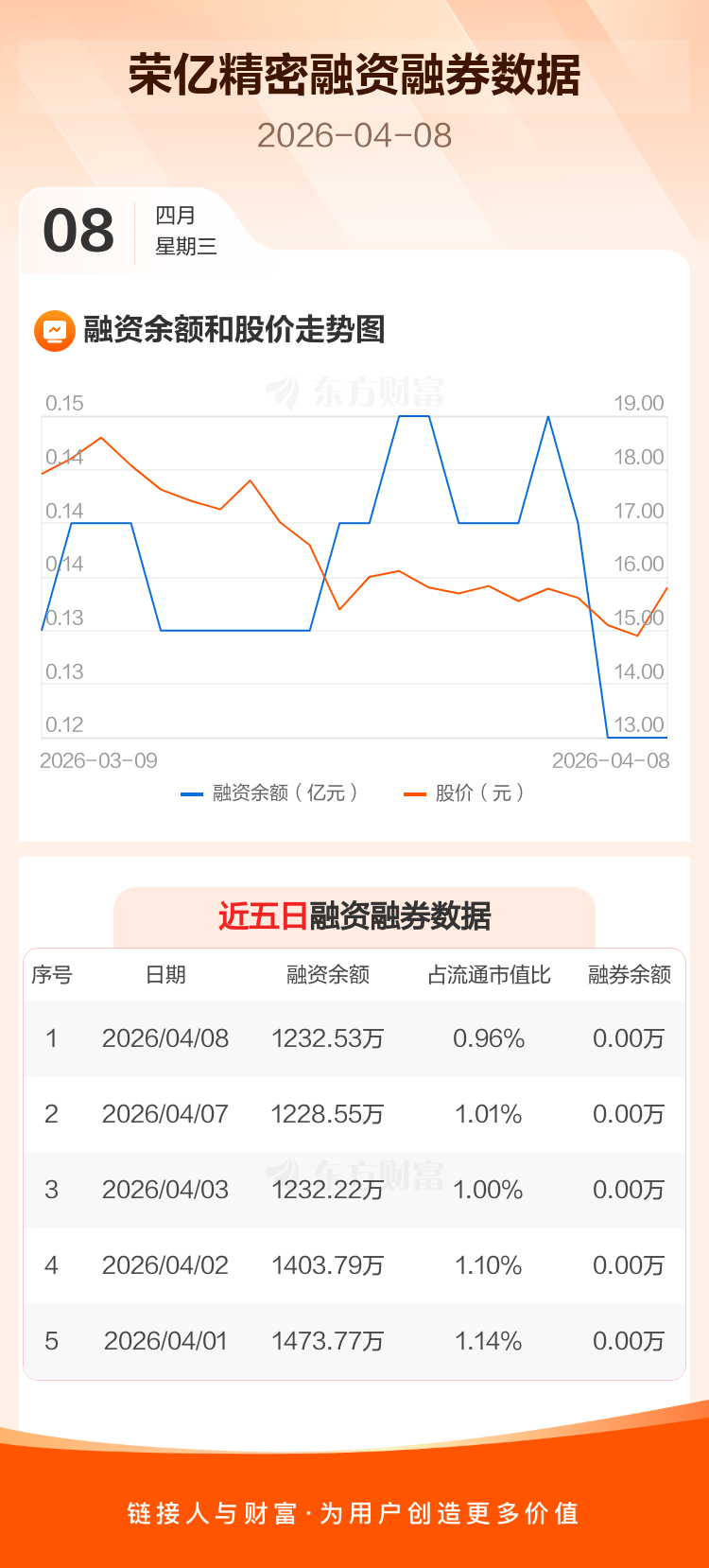 交易所最新数据显示,荣亿精密于2026年4月8日获融资买入21.40万元,融资偿还17.42万元,当日融资净买入3.98万元。目前,该股融资余额1232.53万,占流通市值比例为0.96%。