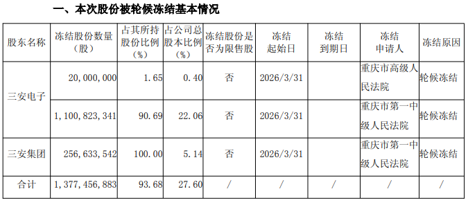 此外,三安光电披露,公司近日收到间接控股股东三安集团通知,三安集团和控股股东三安电子所持公司股份被轮候冻结。本次轮候冻结股份合计13.77亿股,占其所持股份比例93.68%,占公司总股本比例27.60%。截至公告披露日,三安电子和三安集团累计被司法冻结股份合计14.70亿股,占其所持股份比例100%,占公司总股本比例29.47%。