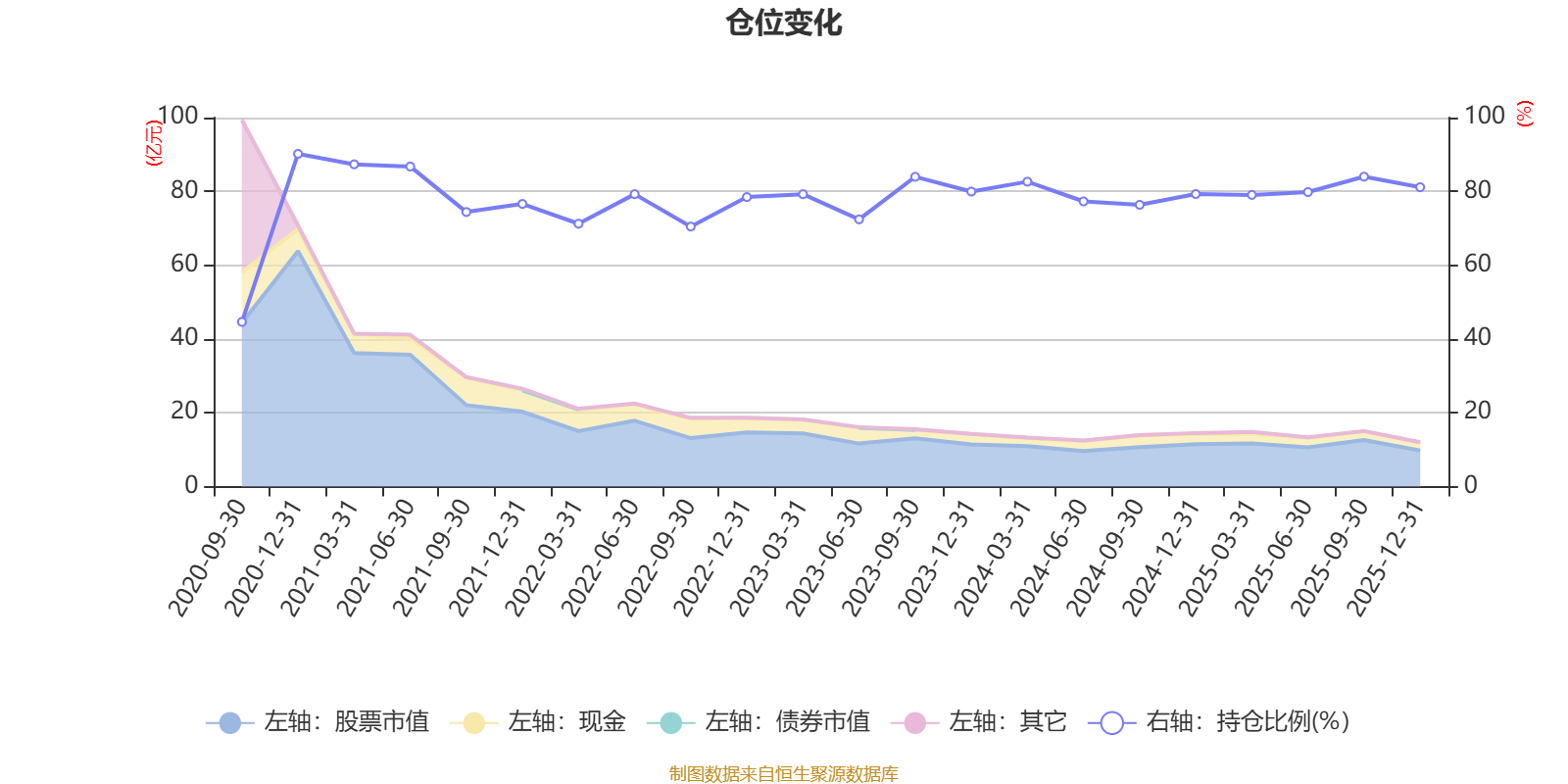 据定期报告数据统计,近三年平均股票仓位为79.59%,同类平均为87.64%。2020年末基金达到90.18%的最高仓位,2020年三季度末最低,为44.62%。