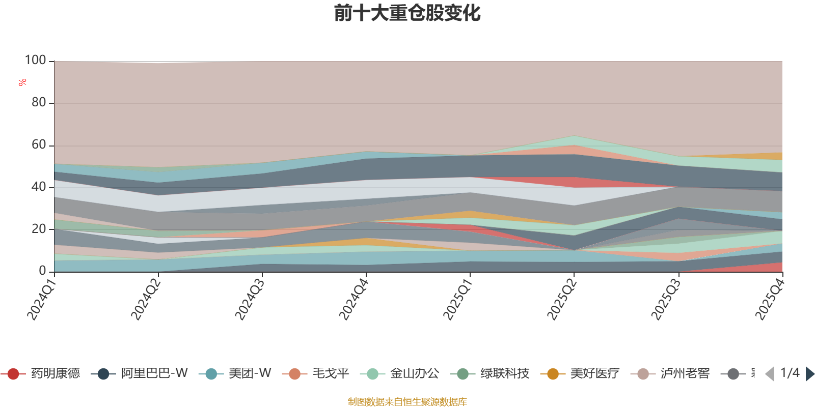 该基金持股集中度较高。截至2025年末,基金十大重仓股分别是腾讯控股、泡泡玛特、金山办公、恒瑞医药、贝壳-W、阿里巴巴-W、药明康德、美团-W、中芯国际、中国联通。