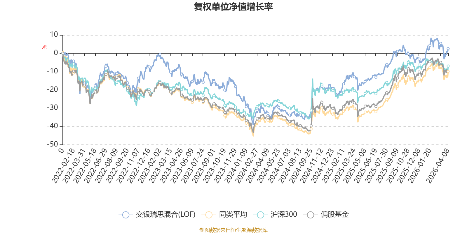 截至4月8日,交银瑞思混合(LOF)近三个月复权单位净值增长率为0.35%,位于同类可比基金67/185;近半年复权单位净值增长率为-1.51%,位于同类可比基金113/185;近一年复权单位净值增长率为27.76%,位于同类可比基金135/185;近三年复权单位净值增长率为11.49%,位于同类可比基金101/177。