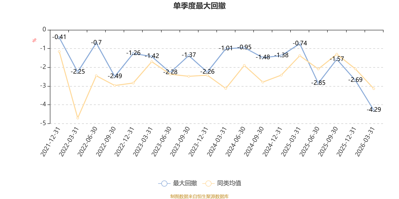截至4月8日,基金近三年最大回撤为4.29%,同类可比基金排名57/236。单季度最大回撤出现在2026年一季度,为4.29%。