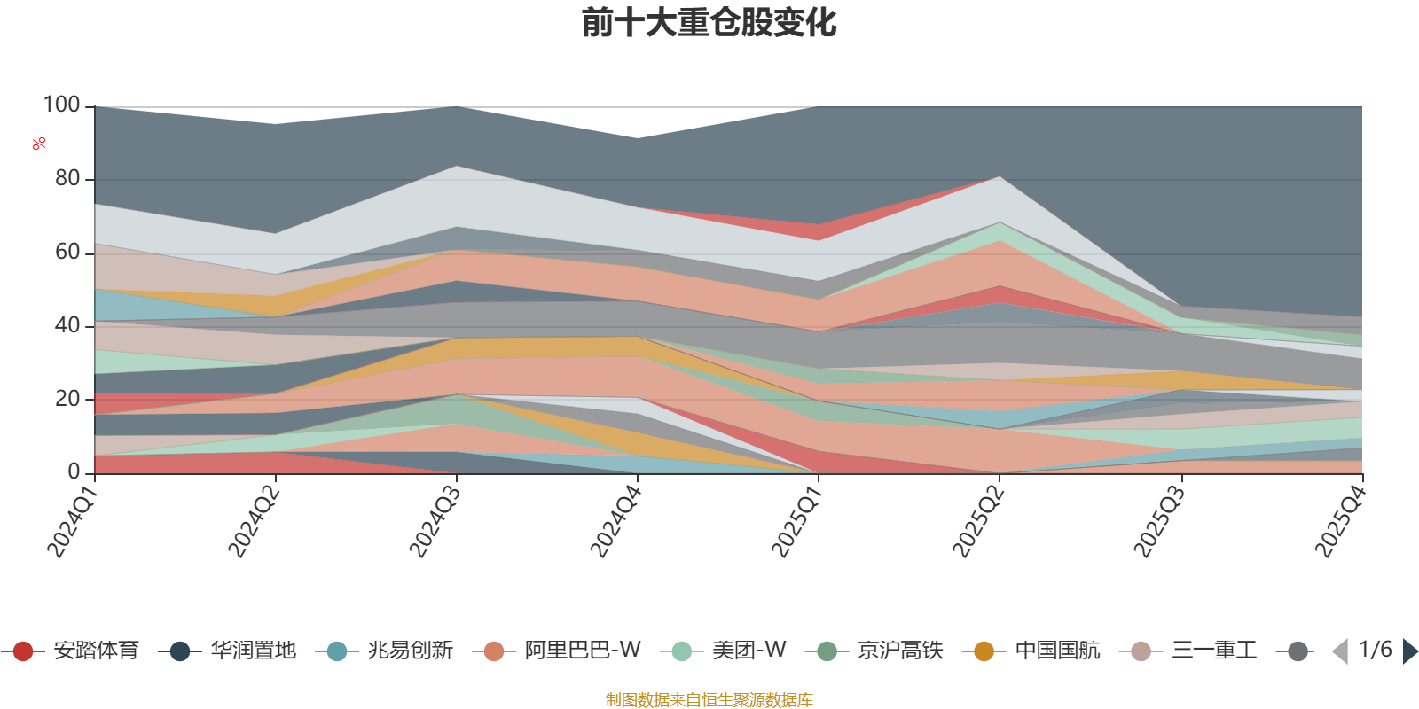 截至2025年末,基金十大重仓股分别是腾讯控股、宁德时代、紫金矿业、宇通客车、中国宏桥、京东方A、阿里巴巴-W、英科医疗、紫金黄金国际、寒武纪。