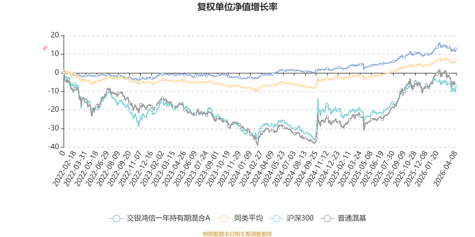 截至4月8日,交银鸿信一年持有期混合A近三个月复权单位净值增长率为0.58%,位于同类可比基金287/629;近半年复权单位净值增长率为1.77%,位于同类可比基金267/629;近一年复权单位净值增长率为10.41%,位于同类可比基金184/629;近三年复权单位净值增长率为13.77%,位于同类可比基金193/581。