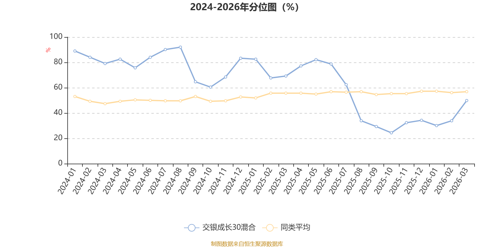 通过所选区间该基金净值增长率分位图,可以观察该基金与同类基金业绩比较情况。图为坐标原点到区间内某时点的净值增长率在同类基金中的分位数。