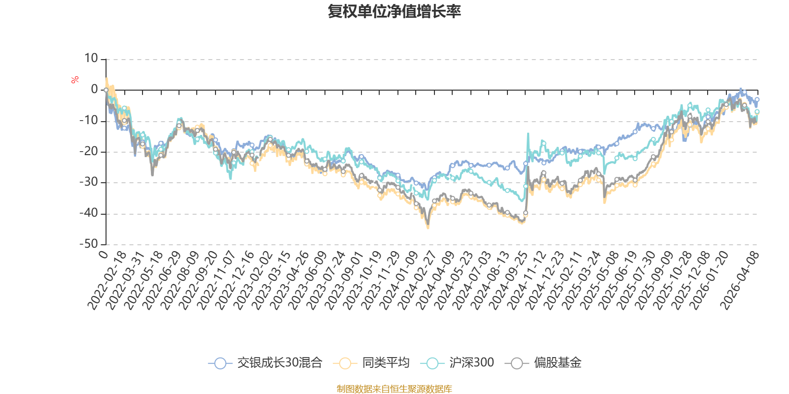 截至4月8日,交银成长30混合近三个月复权单位净值增长率为4.39%,位于同类可比基金54/265;近半年复权单位净值增长率为6.59%,位于同类可比基金79/265;近一年复权单位净值增长率为21.06%,位于同类可比基金224/265;近三年复权单位净值增长率为20.42%,位于同类可比基金117/261。