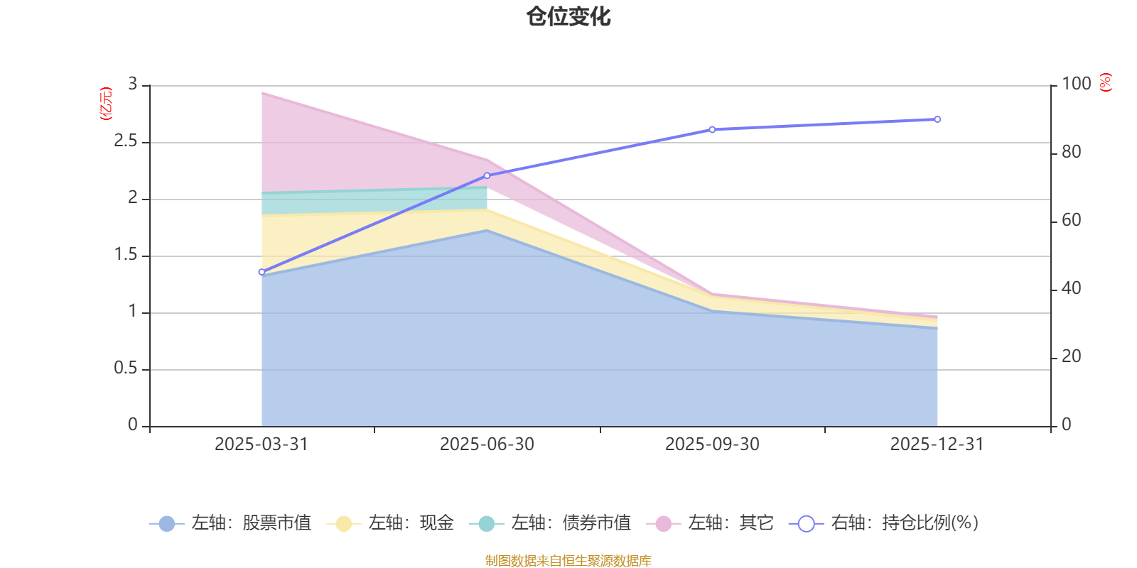 据定期报告数据统计,成立以来平均股票仓位为73.91%,同类平均为86.9%。2025年末基金达到90%的最高仓位,2025年一季度末最低,为45.2%。
