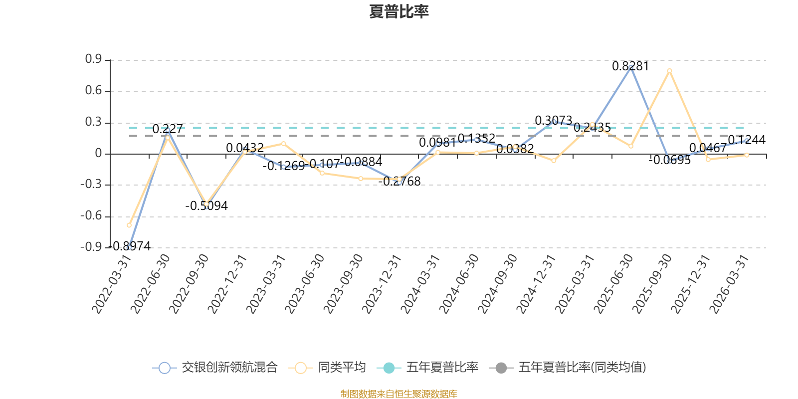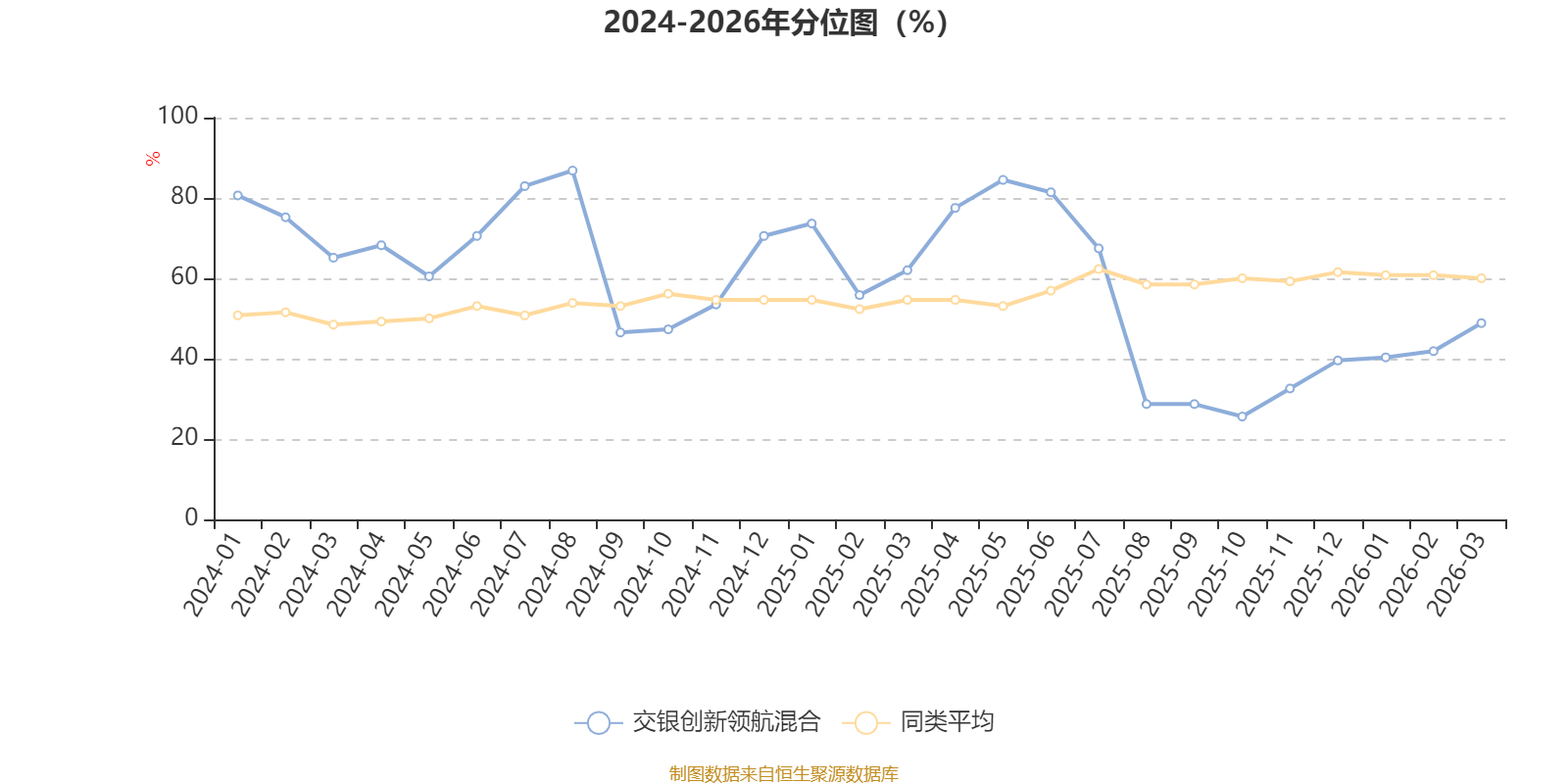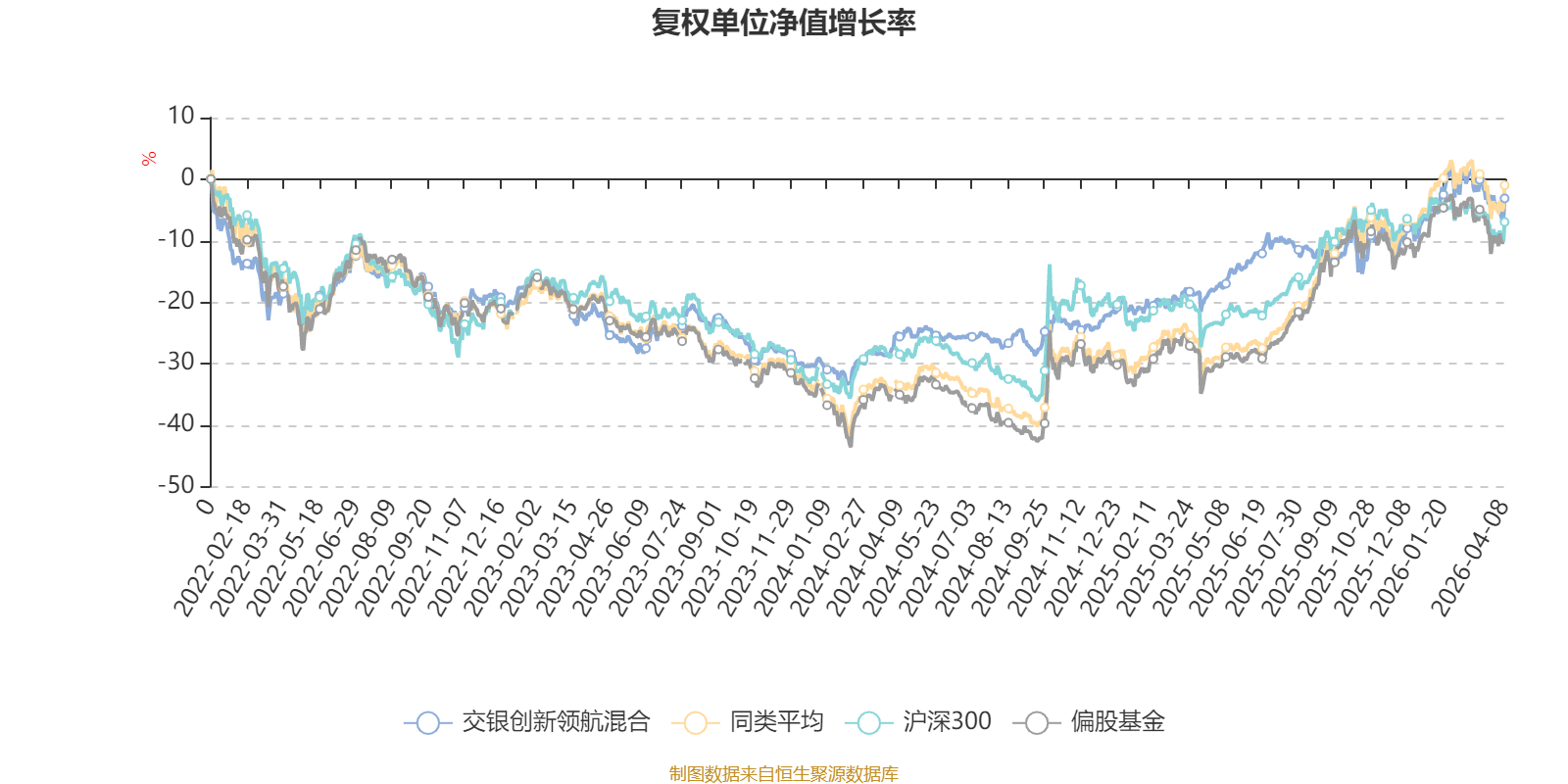 截至4月8日,交银创新领航混合近三个月复权单位净值增长率为2.22%,位于同类可比基金35/130;近半年复权单位净值增长率为4.62%,位于同类可比基金40/130;近一年复权单位净值增长率为21.81%,位于同类可比基金101/130;近三年复权单位净值增长率为21.48%,位于同类可比基金54/126。