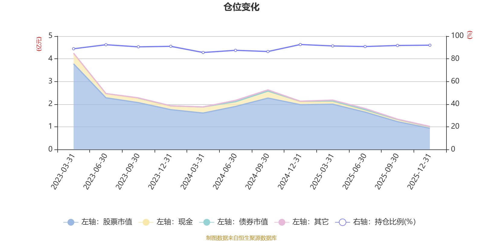 据定期报告数据统计,近三年平均股票仓位为90.09%,同类平均为85.83%。2024年末基金达到92.61%的最高仓位,2024年一季度末最低,为85.58%。
