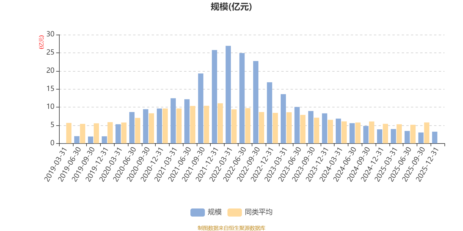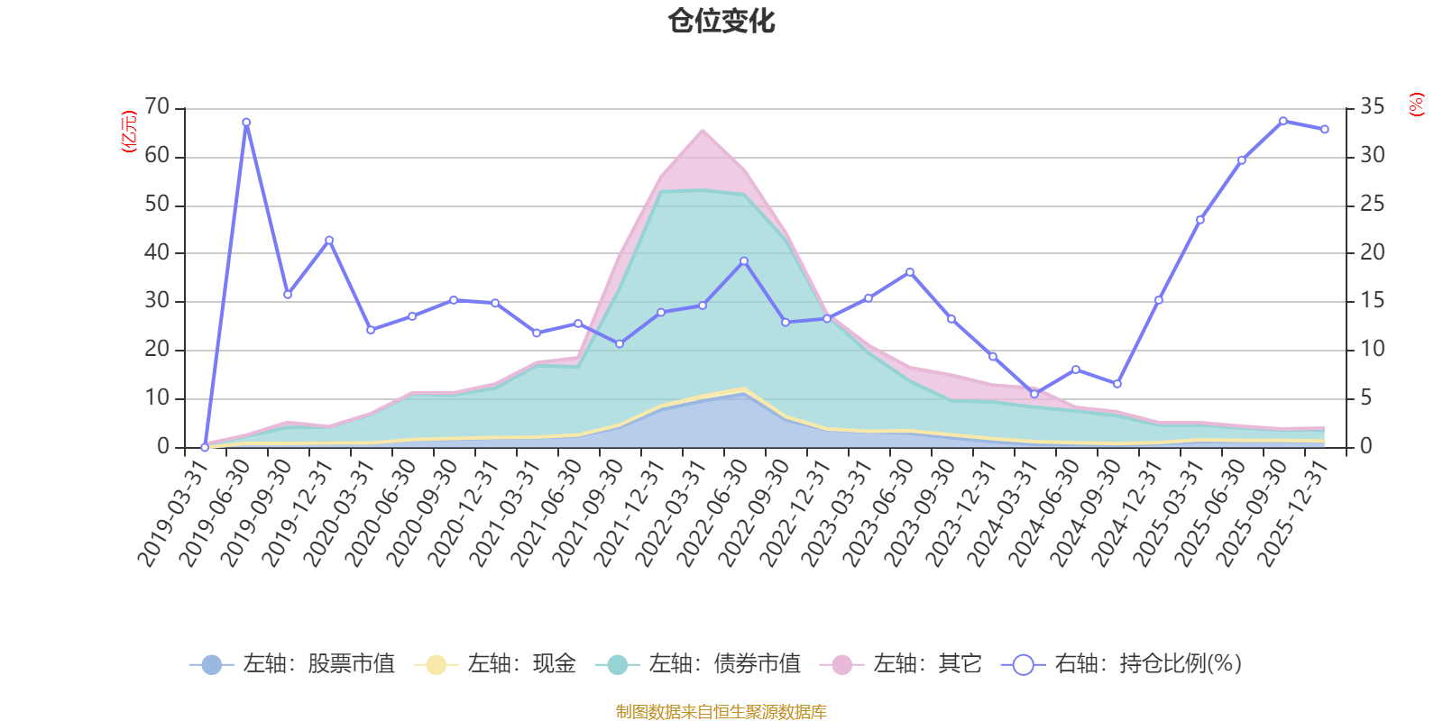 据定期报告数据统计,近三年平均股票仓位为17.59%,同类平均为72.57%。2025年三季度末基金达到33.68%的最高仓位,2024年一季度末最低,为5.51%。