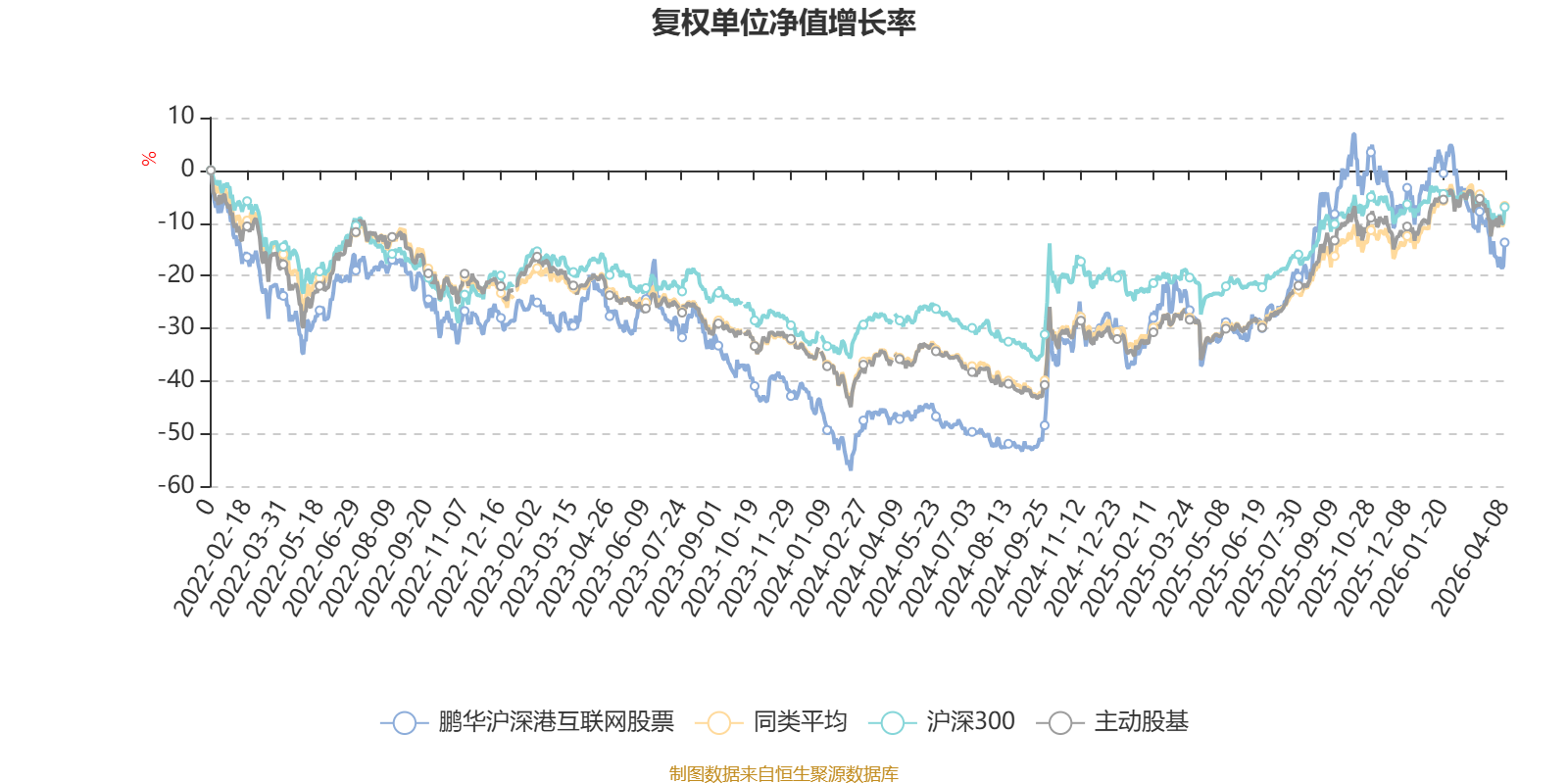 截至4月8日,鹏华沪深港互联网股票近三个月复权单位净值增长率为-13.46%,位于同类可比基金120/121;近半年复权单位净值增长率为-19.24%,位于同类可比基金119/121;近一年复权单位净值增长率为36.60%,位于同类可比基金64/120;近三年复权单位净值增长率为7.25%,位于同类可比基金61/90。