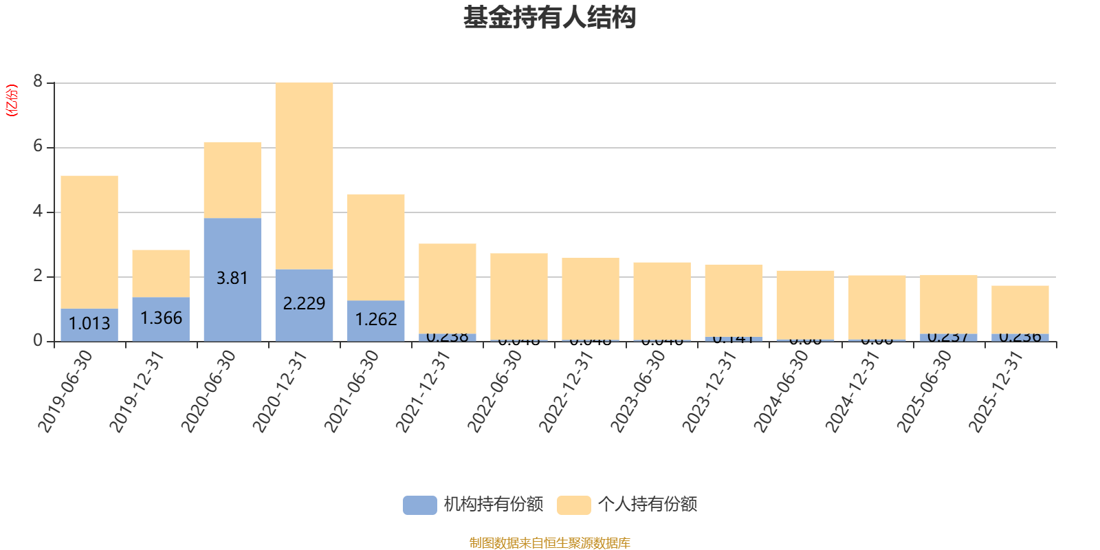 截至2025年12月31日,基金持有人共计1.1万户,合计持有1.72亿份。其中管理人员工持有53.41万份,占比0.31%,机构持有份额占比13.73%,个人投资者占比86.27%。