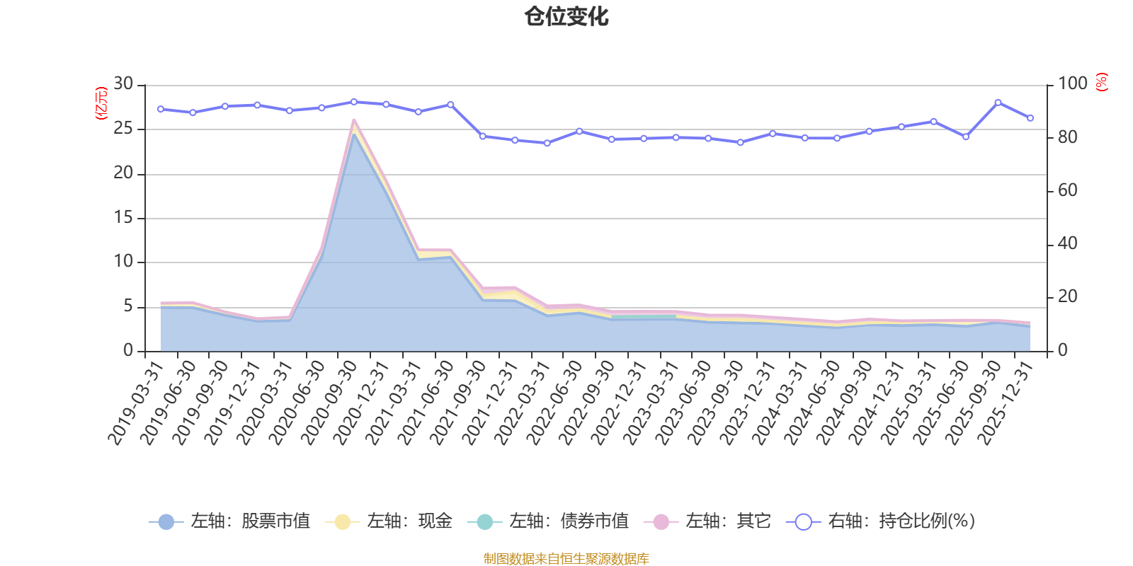 基金管理人在年报中表示,展望2026年,我们认为市场目前的一致预期过于强烈,市场一致预期的看好AI硬件、AI应用以及有色金属行业。我们认为在消费领域依然存在一些质地非常优秀的公司,尽管它们的增长空间有限,但它们持续创造现金流,而投资的本源其实是自由现金流,尽管这一点在2025年几乎被遗忘。我们认为2026年超级低位的资产有望上涨。