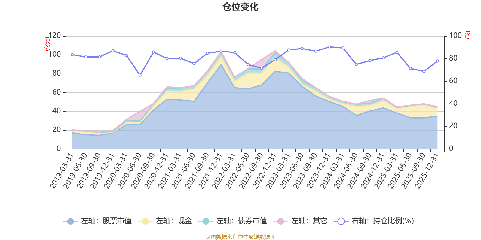 据定期报告数据统计,近三年平均股票仓位为81.64%,同类平均为86.17%。2023年末基金达到90.29%的最高仓位,2020年上半年末最低,为65.27%。