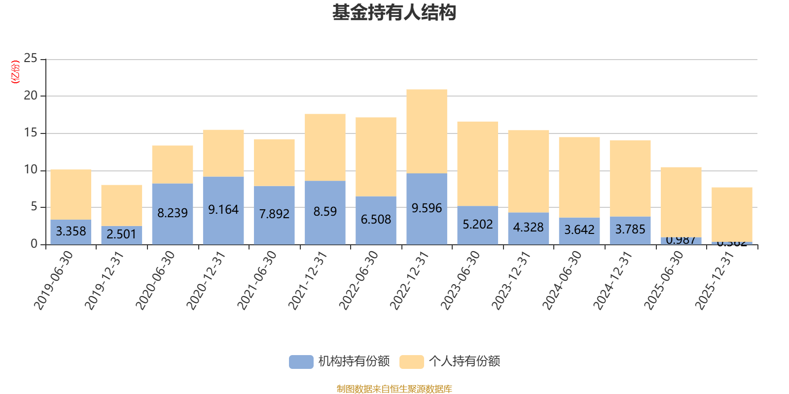 截至2025年12月31日,基金持有人共计35.65万户,合计持有7.7亿份。其中管理人员工持有22.3万份,占比0.03%,机构持有份额占比4.70%,个人投资者占比95.30%。