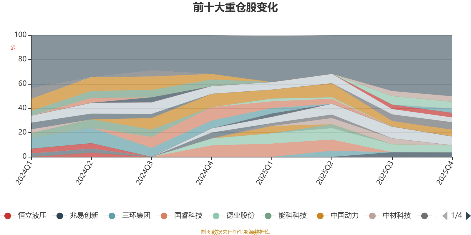 截至2025年末,基金十大重仓股分别是睿创微纳、新易盛、德业股份、中际旭创、洪都航空、紫金矿业、华恒生物、山金国际、兆易创新、美的集团。