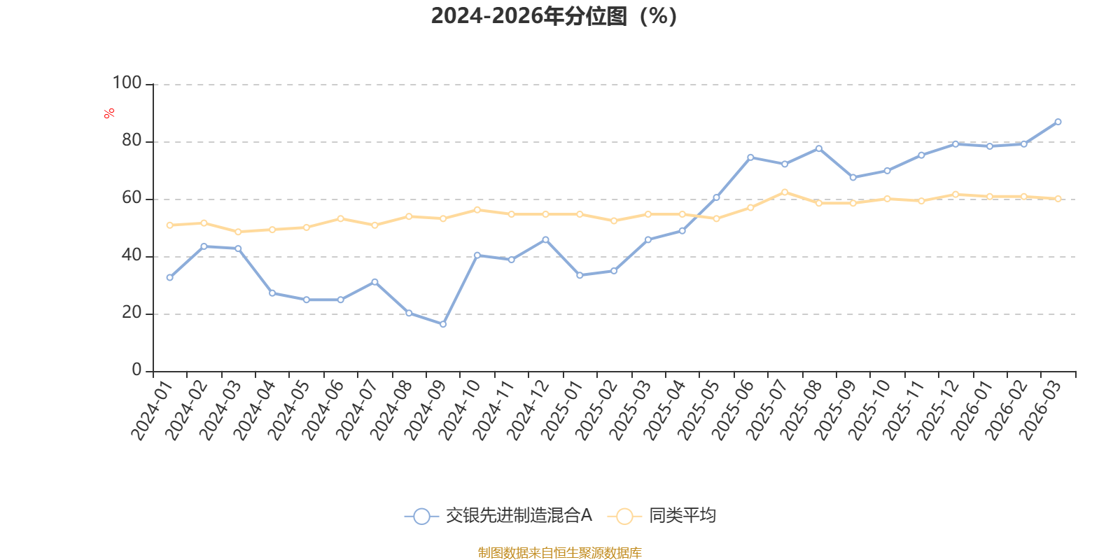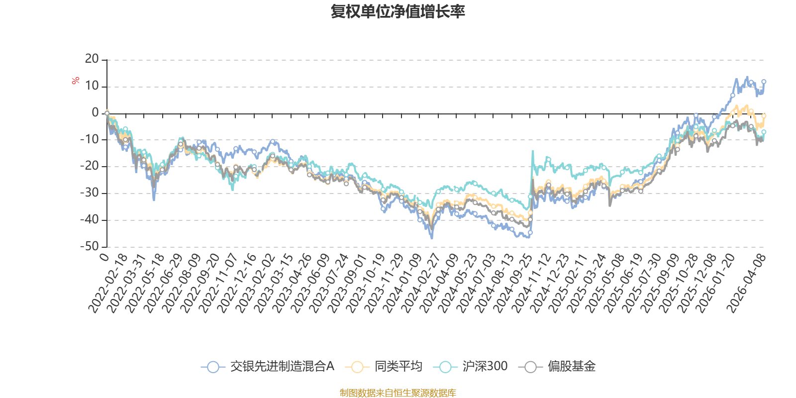 截至4月8日,交银先进制造混合A近三个月复权单位净值增长率为8.44%,位于同类可比基金10/130;近半年复权单位净值增长率为14.45%,位于同类可比基金10/130;近一年复权单位净值增长率为68.17%,位于同类可比基金23/130;近三年复权单位净值增长率为32.90%,位于同类可比基金34/126。