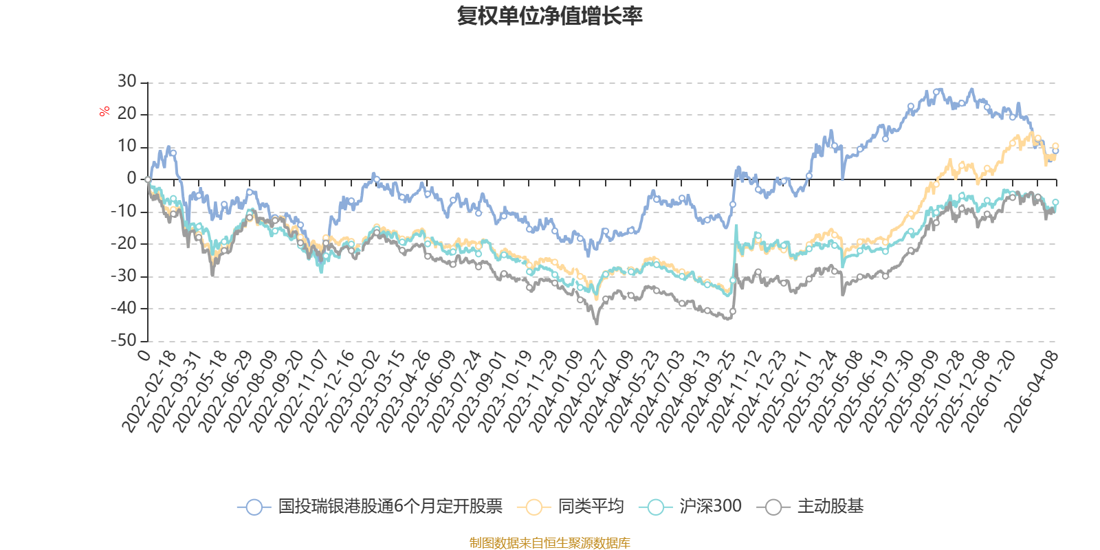 截至4月8日,国投瑞银港股通6个月定开股票近三个月复权单位净值增长率为-9.89%,位于同类可比基金57/58;近半年复权单位净值增长率为-13.26%,位于同类可比基金57/58;近一年复权单位净值增长率为6.95%,位于同类可比基金54/57;近三年复权单位净值增长率为13.74%,位于同类可比基金43/57。