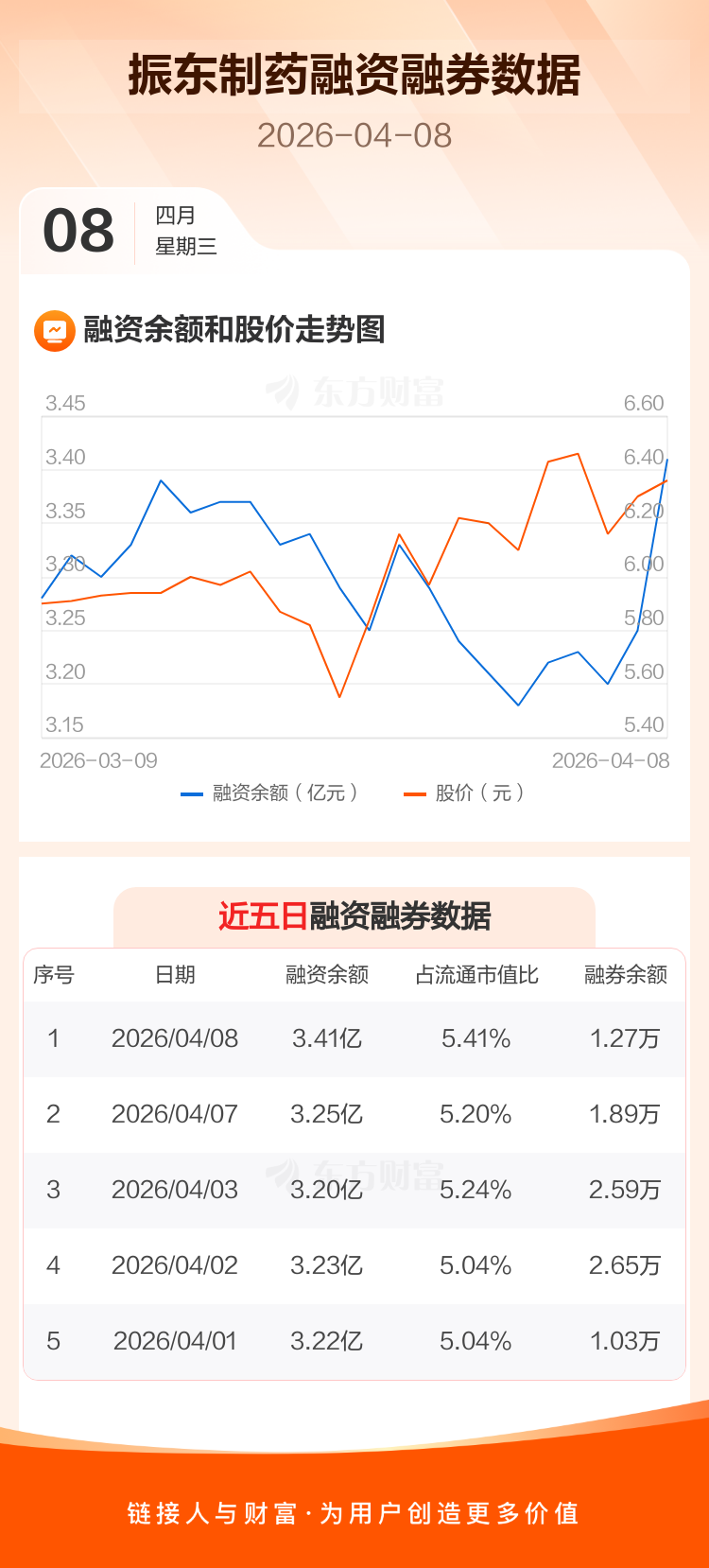 交易所最新数据显示,振东制药于2026年4月8日获融资买入3117.74万元,融资偿还1503.18万元,当日融资净买入1614.56万元。目前,该股融资余额3.41亿,占流通市值比例为5.41%。