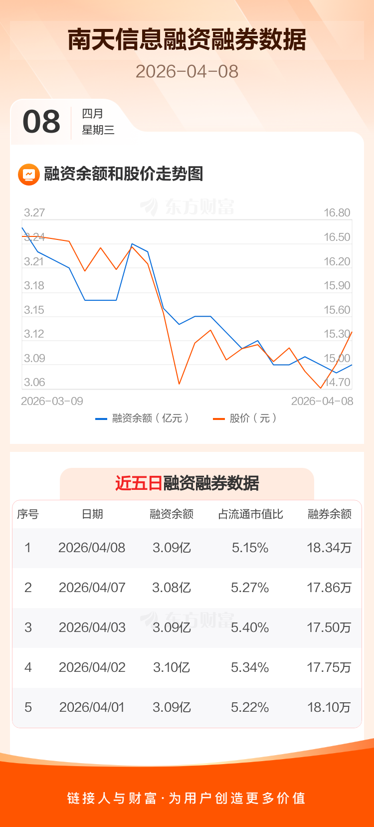 交易所最新数据显示,南天信息于2026年4月8日获融资买入955.31万元,融资偿还819.02万元,当日融资净买入136.28万元。目前,该股融资余额3.09亿,占流通市值比例为5.15%。