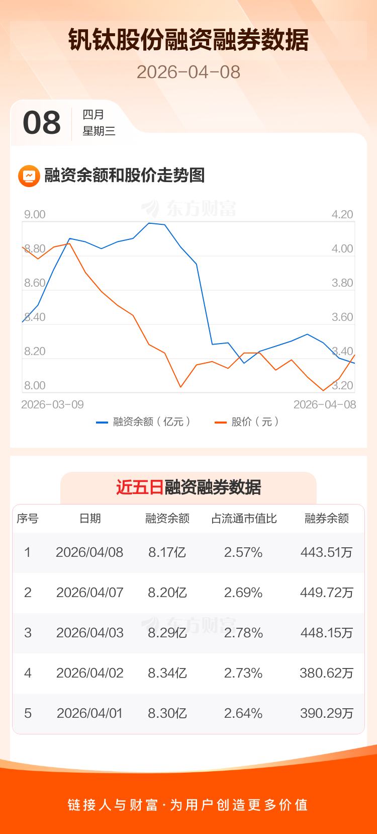 交易所最新数据显示,钒钛股份于2026年4月8日获融资买入3326.89万元,融资偿还3564.39万元,当日融资净偿还237.51万元。目前,该股融资余额8.17亿,占流通市值比例为2.57%。