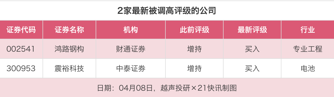 评级调高方面,4月8日,券商调高上市公司评级2家次,最新数据包括了财通证券对鸿路钢构的评级从“增持”调高至“买入”,中泰证券对震裕科技的评级从“增持”调高至“买入”。