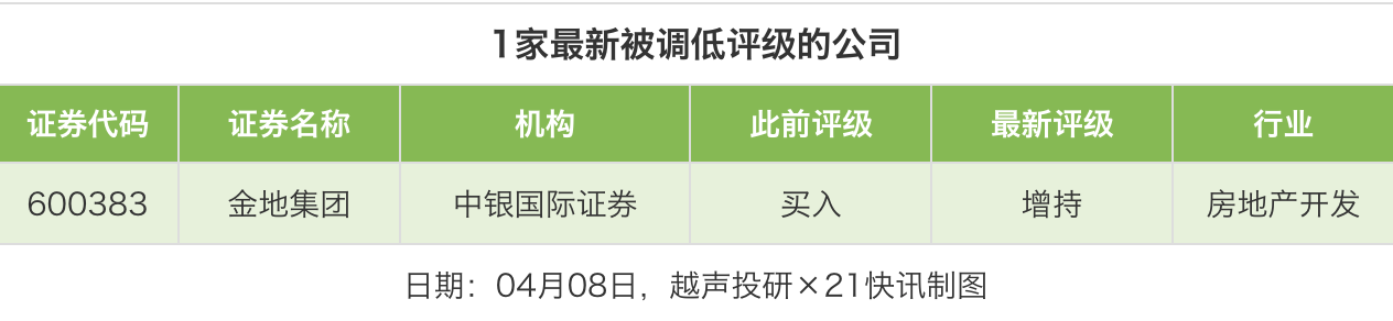 评级调低方面,4月8日,券商调低上市公司评级1家次,中银国际证券对金地集团的评级从“买入”调低至“增持”。