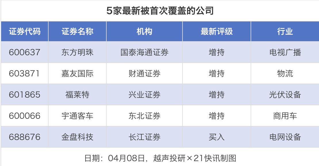 首次覆盖方面,4月8日券商共给出了5次首次覆盖,其中东方明珠获得国泰海通证券给予“增持”评级,嘉友国际获得财通证券给予“增持”评级,福莱特获得兴业证券给予“增持”评级,宇通客车获得东北证券给予“增持”评级,金盘科技获得长江证券给予“买入”评级。