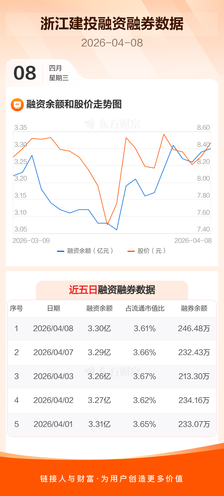 交易所最新数据显示,浙江建投于2026年4月8日获融资买入1542.68万元,融资偿还1392.53万元,当日融资净买入150.16万元。目前,该股融资余额3.30亿,占流通市值比例为3.61%。