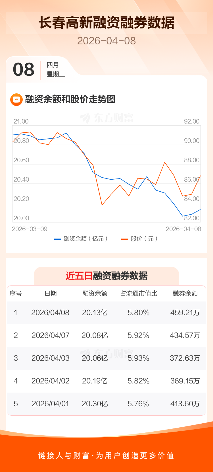 交易所最新数据显示,长春高新于2026年4月8日获融资买入5234.07万元,融资偿还4754.42万元,当日融资净买入479.65万元。目前,该股融资余额20.13亿,占流通市值比例为5.80%。