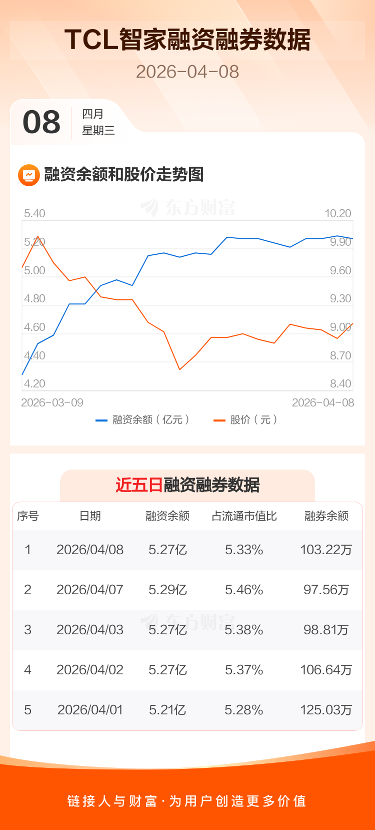 交易所最新数据显示,TCL智家于2026年4月8日获融资买入697.61万元,融资偿还981.93万元,当日融资净偿还284.33万元。目前,该股融资余额5.27亿,占流通市值比例为5.33%。