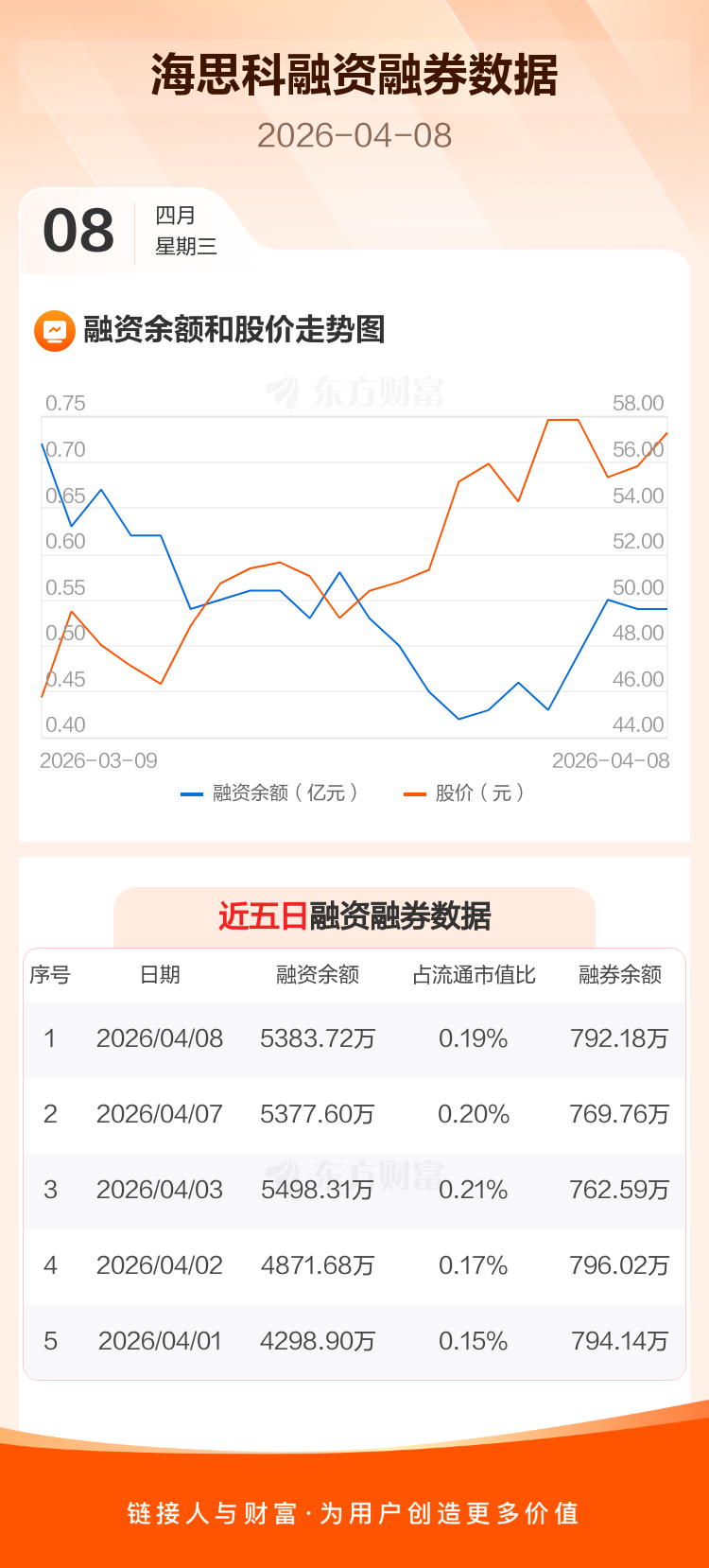 交易所最新数据显示,海思科于2026年4月8日获融资买入1345.49万元,融资偿还1339.37万元,当日融资净买入6.12万元。目前,该股融资余额5383.72万,占流通市值比例为0.19%。