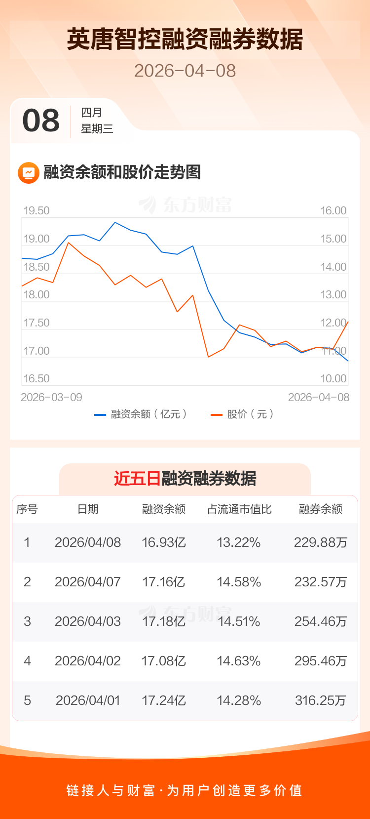 交易所最新数据显示,英唐智控于2026年4月8日获融资买入1.19亿元,融资偿还1.43亿元,当日融资净偿还2306.31万元。目前,该股融资余额16.93亿,占流通市值比例为13.22%。