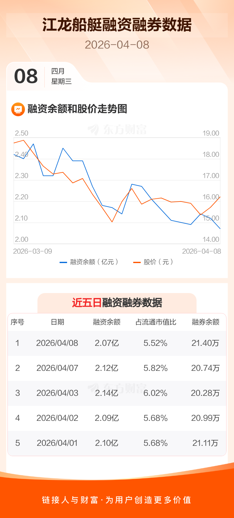 交易所最新数据显示,江龙船艇于2026年4月8日获融资买入2343.94万元,融资偿还2776.40万元,当日融资净偿还432.47万元。目前,该股融资余额2.07亿,占流通市值比例为5.52%。