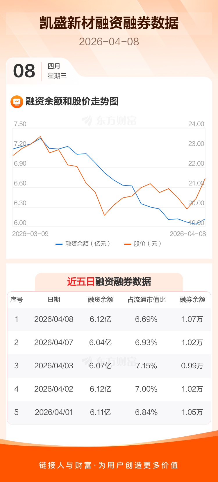 交易所最新数据显示,凯盛新材于2026年4月8日获融资买入2427.25万元,融资偿还1593.14万元,当日融资净买入834.11万元。目前,该股融资余额6.12亿,占流通市值比例为6.69%。