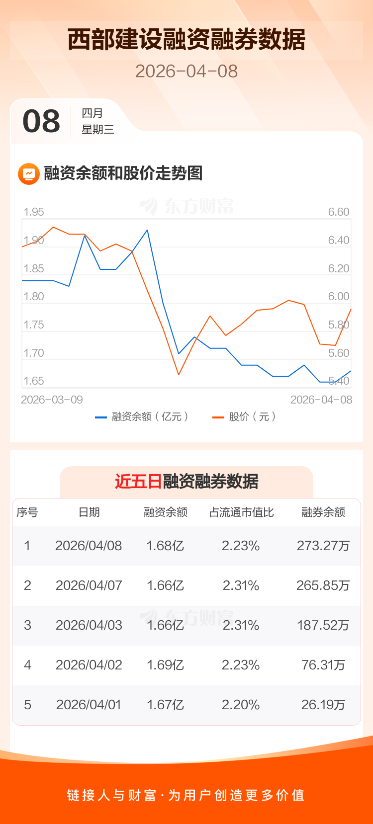 交易所最新数据显示,西部建设于2026年4月8日获融资买入668.86万元,融资偿还536.26万元,当日融资净买入132.6万元。目前,该股融资余额1.68亿,占流通市值比例为2.23%。