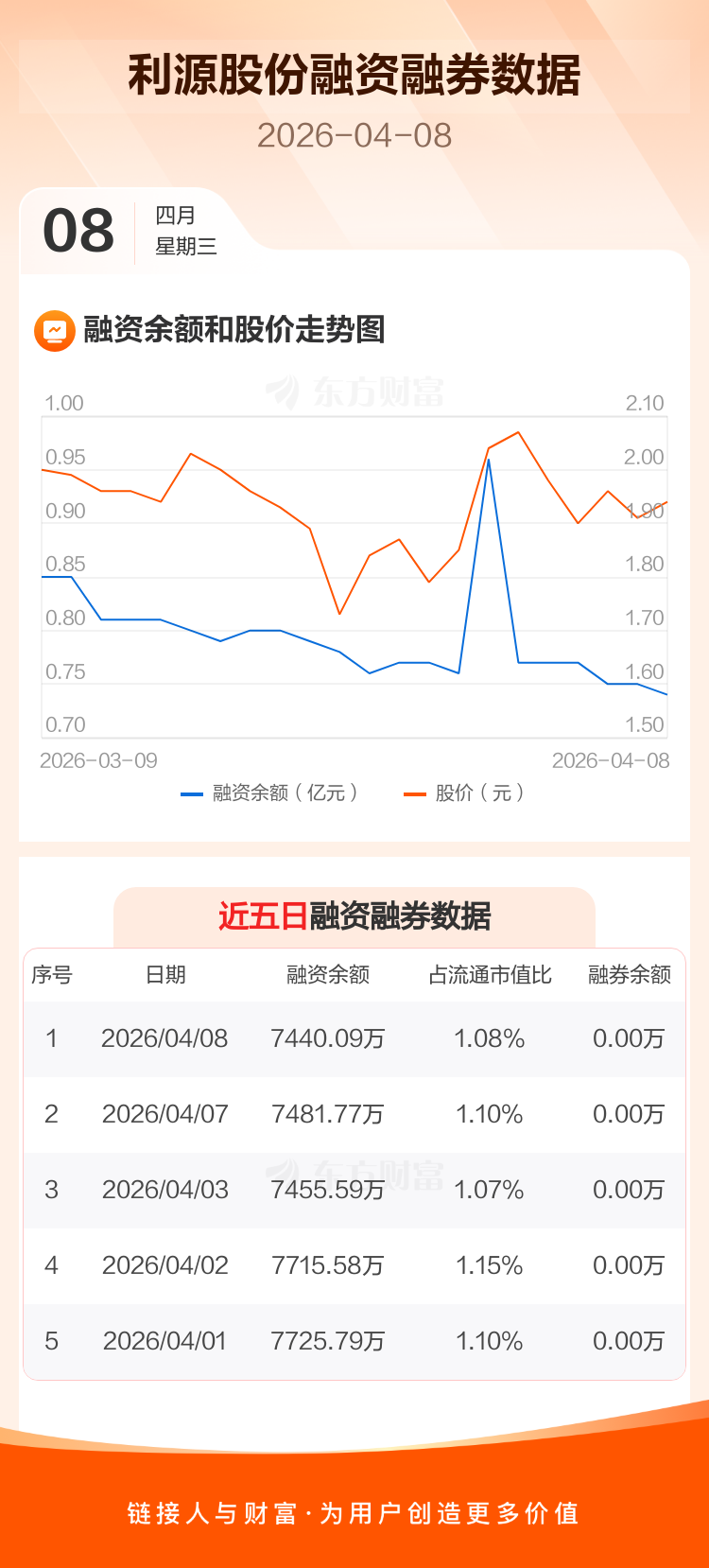 交易所最新数据显示,利源股份于2026年4月8日获融资买入320.36万元,融资偿还362.04万元,当日融资净偿还41.68万元。目前,该股融资余额7440.09万,占流通市值比例为1.08%。