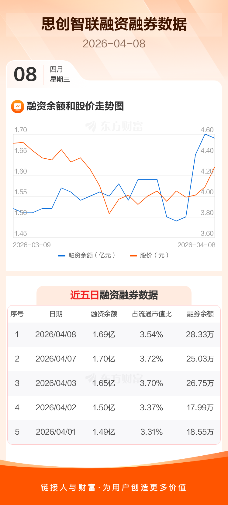 交易所最新数据显示,思创智联于2026年4月8日获融资买入657.70万元,融资偿还742.94万元,当日融资净偿还85.24万元。目前,该股融资余额1.69亿,占流通市值比例为3.54%。