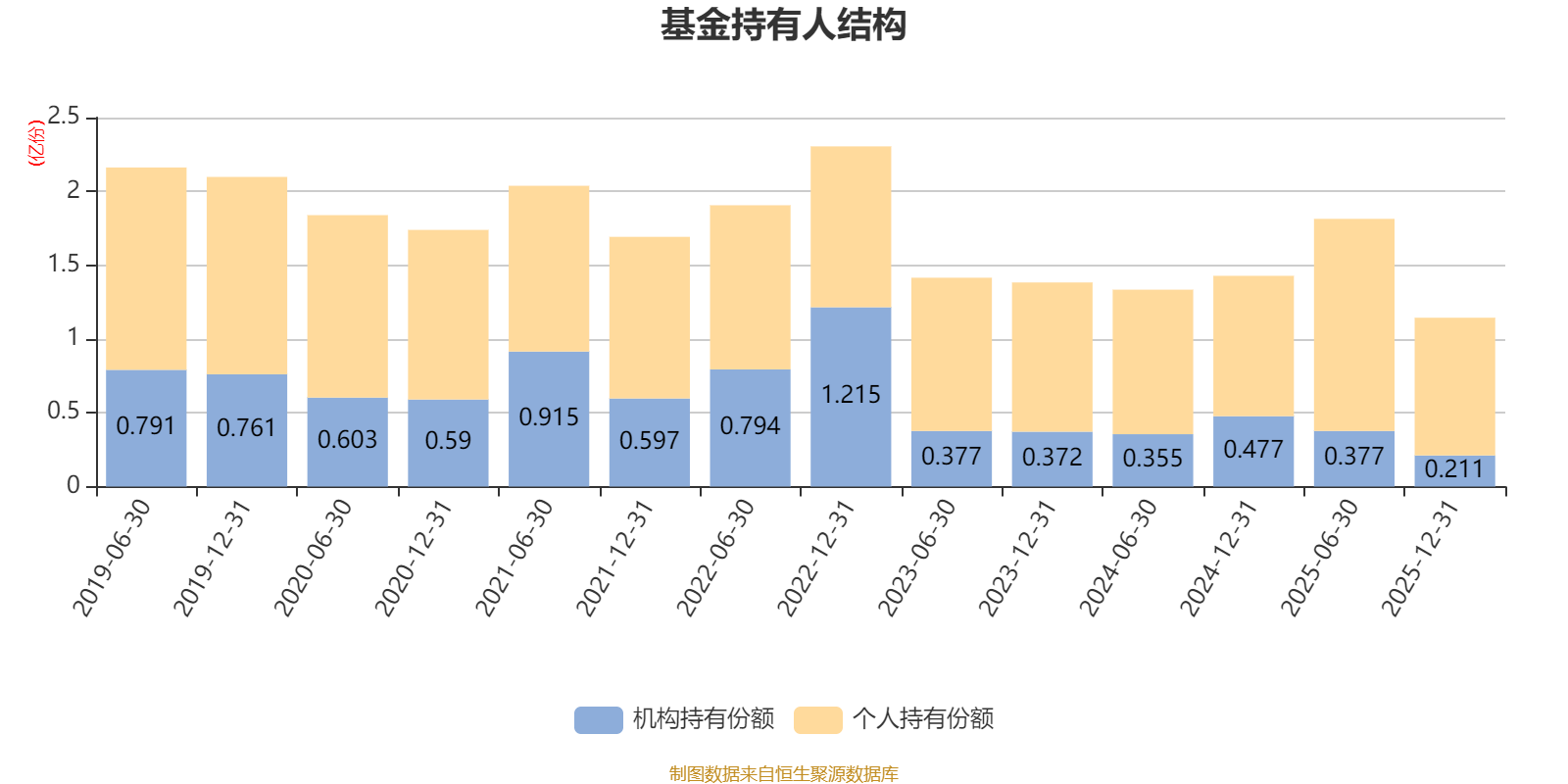 截至2025年12月31日,基金持有人共计1.38万户,合计持有1.14亿份。其中管理人员工持有44.68万份,占比0.39%,机构持有份额占比18.44%,个人投资者占比81.56%。