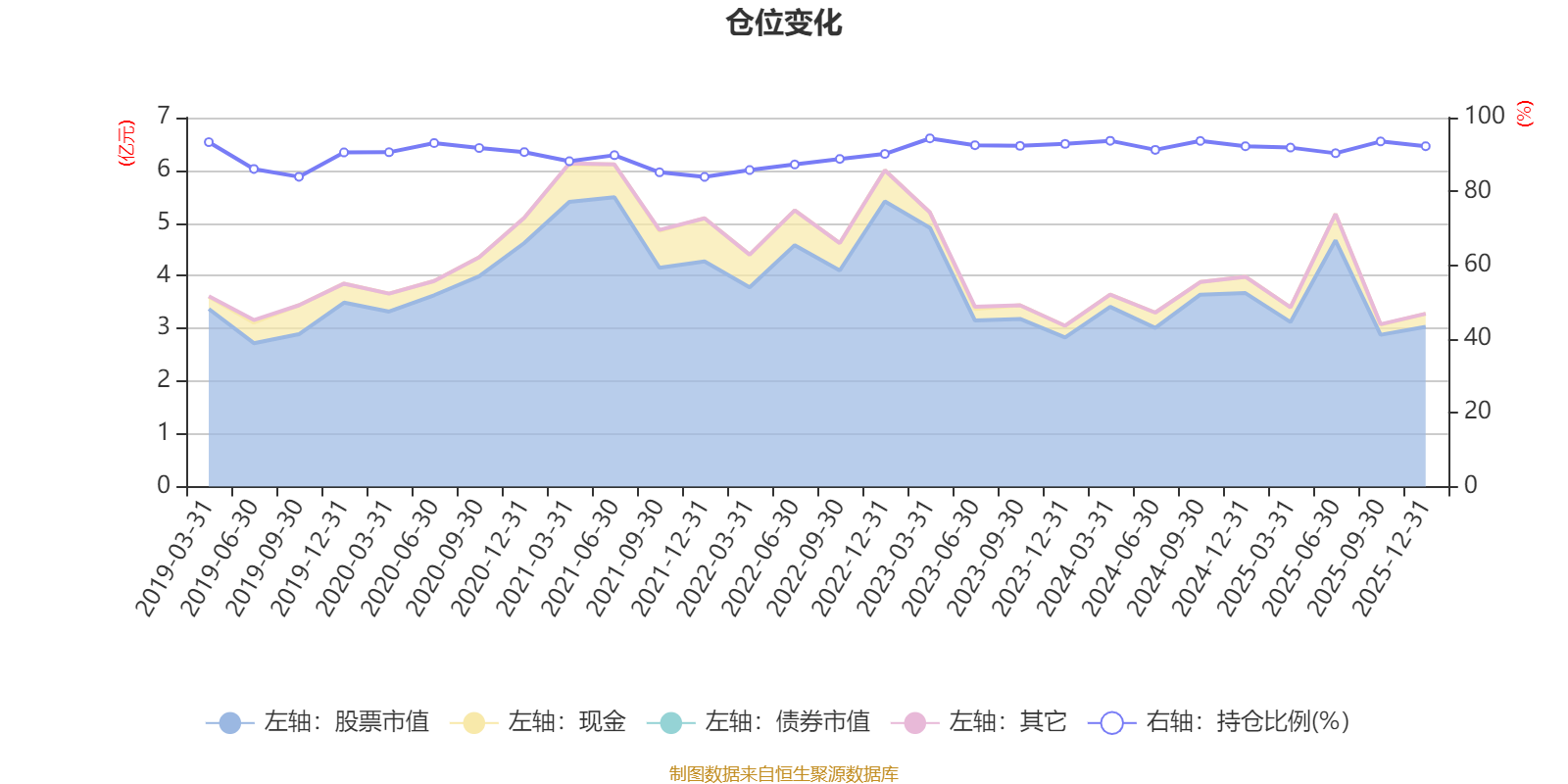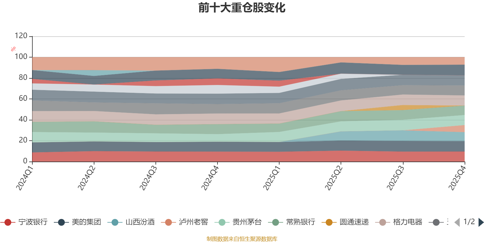 该基金持股集中度较高,且持股标的较为稳定,近2年前十大重仓股集中度长期超过60%。截至2025年末,基金十大重仓股分别是中国平安、美的集团、格力电器、贵州茅台、招商银行、宁波银行、五粮液、常熟银行、山西汾酒、泸州老窖。