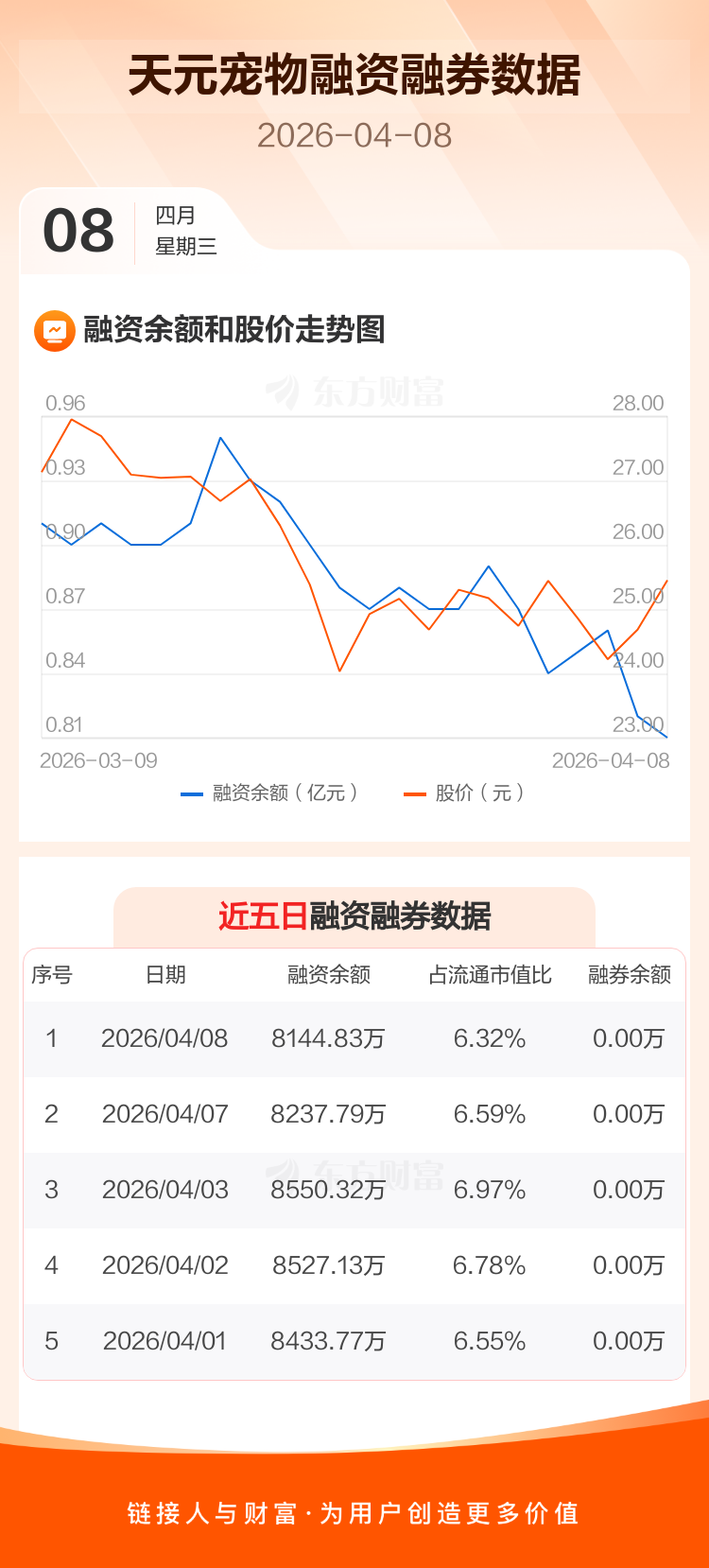 交易所最新数据显示,天元宠物于2026年4月8日获融资买入238.90万元,融资偿还331.85万元,当日融资净偿还92.96万元。目前,该股融资余额8144.83万,占流通市值比例为6.32%。