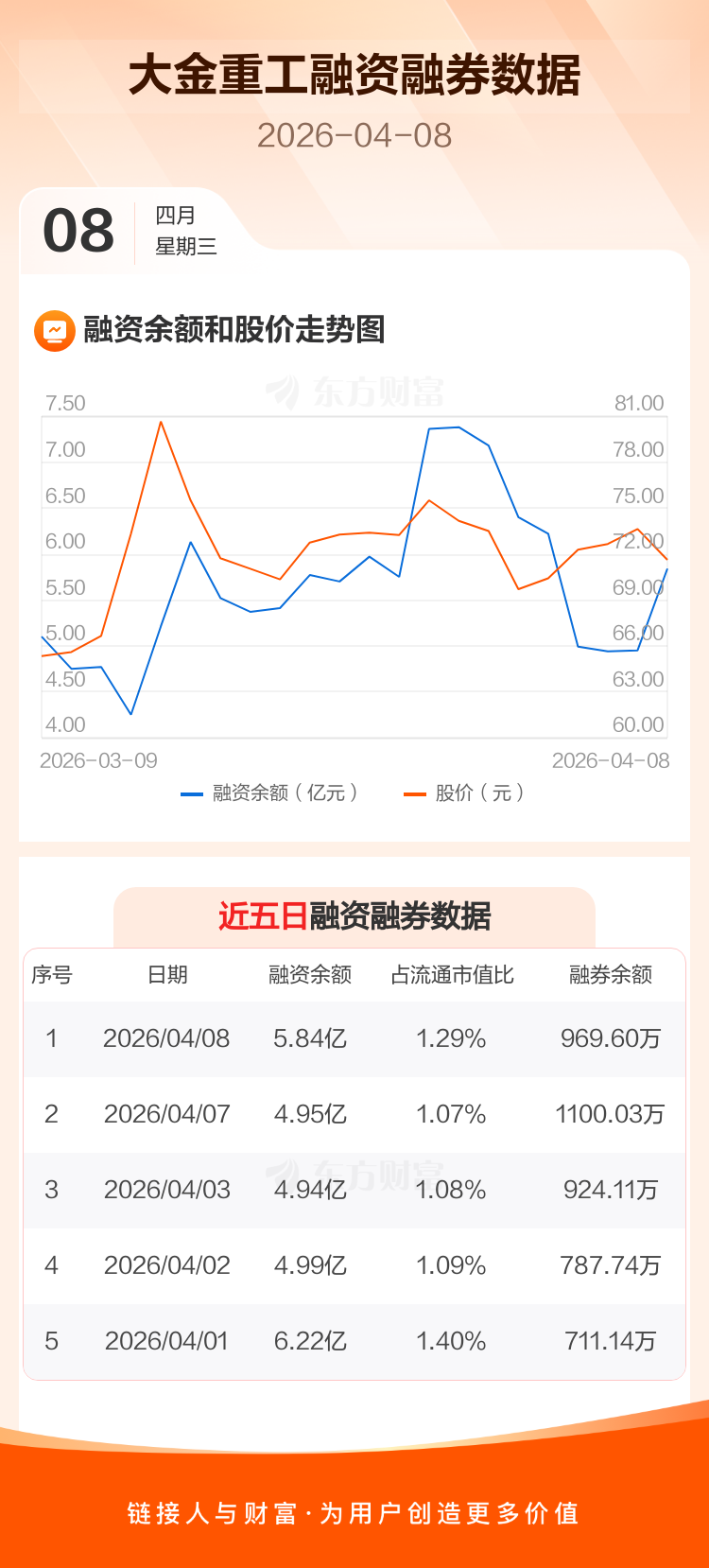 交易所最新数据显示,大金重工于2026年4月8日获融资买入1.72亿元,融资偿还8275.13万元,当日融资净买入8904.95万元。目前,该股融资余额5.84亿,占流通市值比例为1.29%。