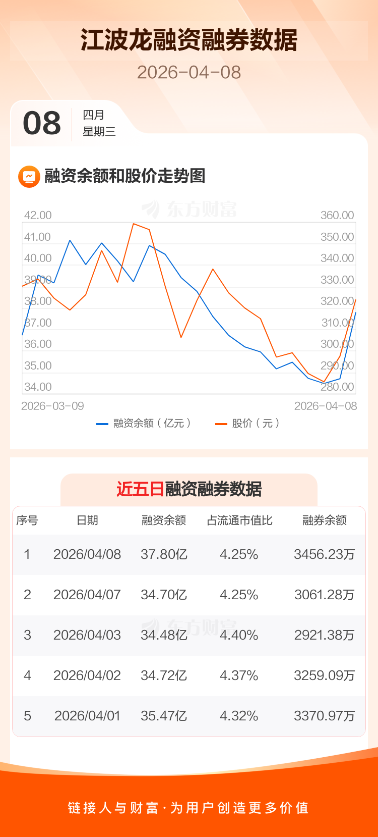 交易所最新数据显示,江波龙于2026年4月8日获融资买入8.46亿元,融资偿还5.37亿元,当日融资净买入3.1亿元。目前,该股融资余额37.80亿,占流通市值比例为4.25%。