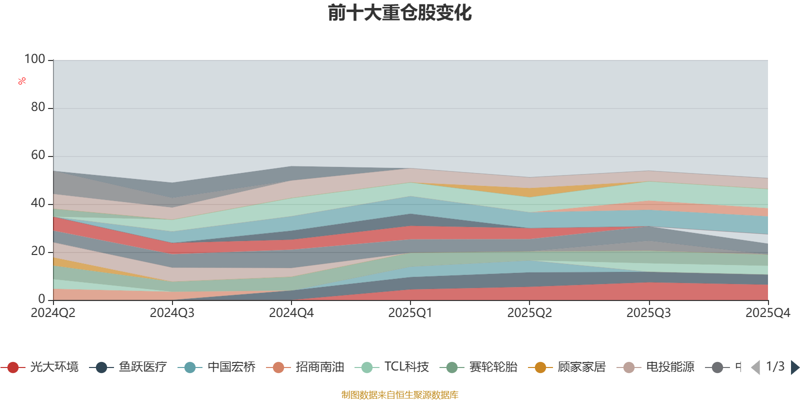 截至2025年末,基金十大重仓股分别是京东方A、太阳纸业、光大环境、赛轮轮胎、裕同科技、中煤能源、鱼跃医疗、博源化工、TCL科技、腾讯控股。