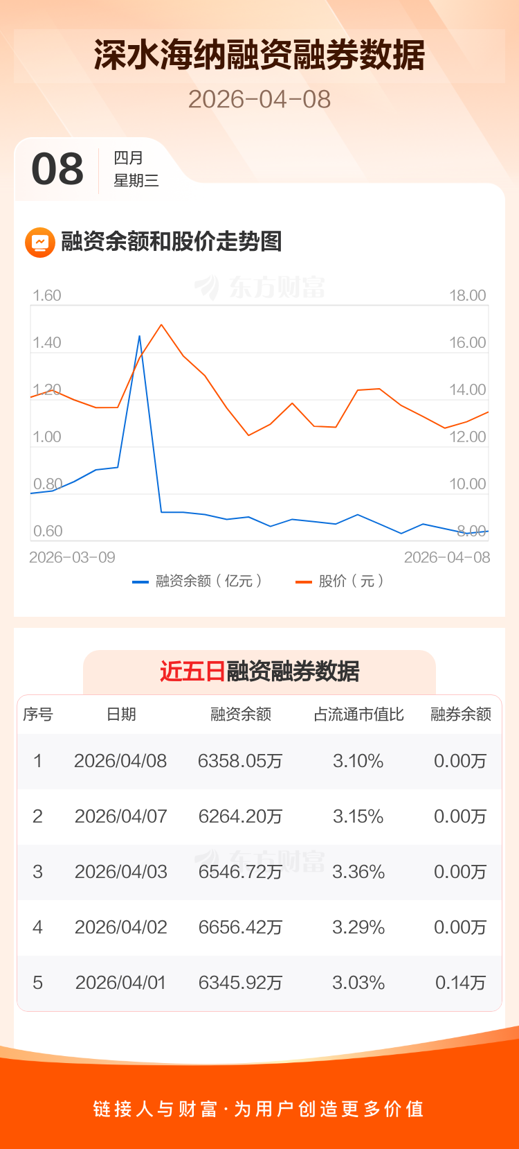 交易所最新数据显示,深水海纳于2026年4月8日获融资买入844.07万元,融资偿还750.22万元,当日融资净买入93.85万元。目前,该股融资余额6358.05万,占流通市值比例为3.10%。