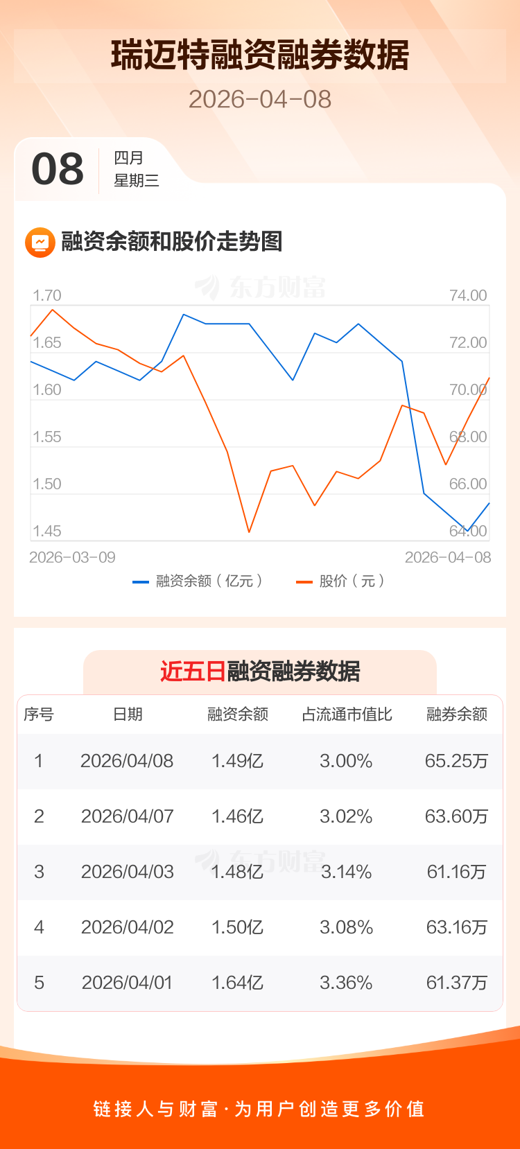 交易所最新数据显示,瑞迈特于2026年4月8日获融资买入915.02万元,融资偿还618.82万元,当日融资净买入296.2万元。目前,该股融资余额1.49亿,占流通市值比例为3.00%。