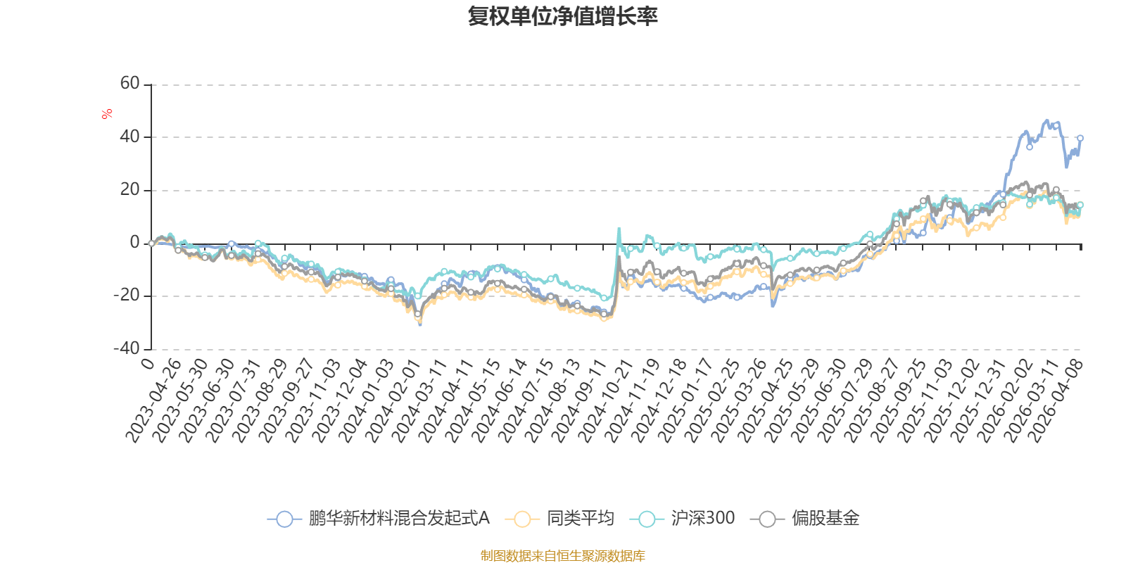 截至4月8日,鹏华新材料混合发起式A近三个月复权单位净值增长率为11.25%,位于同类可比基金52/689;近半年复权单位净值增长率为28.57%,位于同类可比基金33/689;近一年复权单位净值增长率为81.81%,位于同类可比基金71/685;近三年复权单位净值增长率为39.67%,位于同类可比基金73/417。