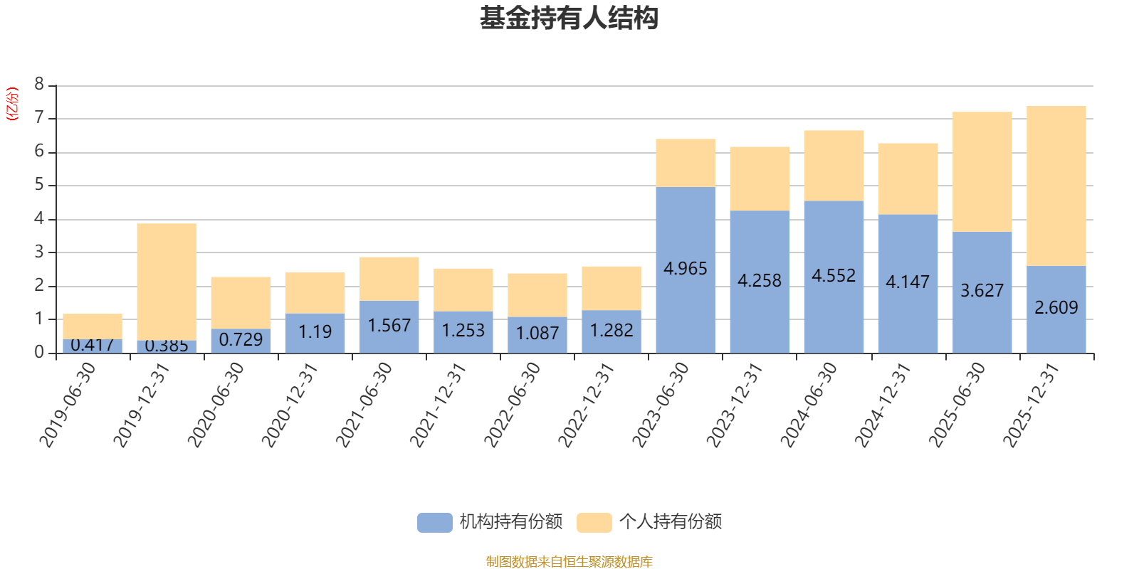 截至2025年12月31日,基金持有人共计4.91万户,合计持有7.38亿份。其中管理人员工持有145.09万份,占比0.20%,机构持有份额占比35.32%,个人投资者占比64.68%。