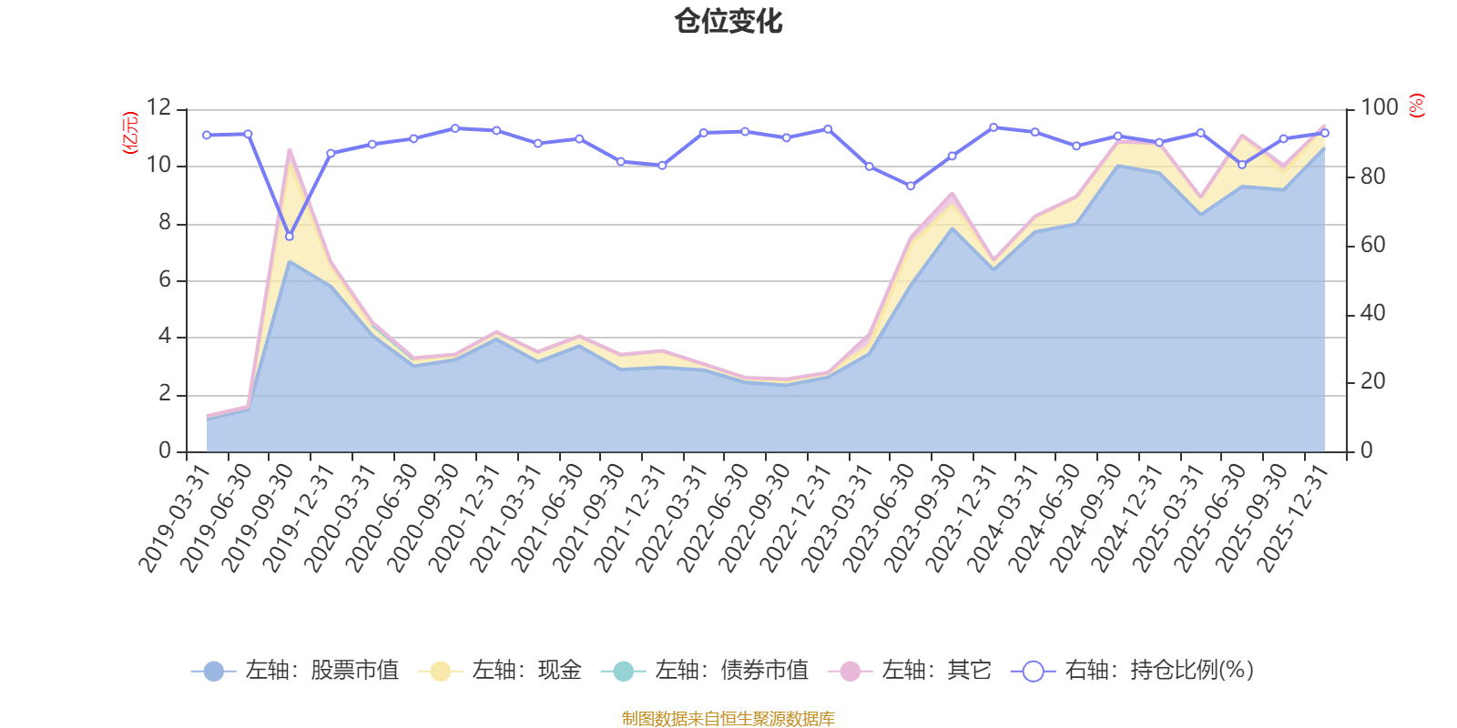 据定期报告数据统计,近三年平均股票仓位为89.03%,同类平均为86.12%。2023年末基金达到94.71%的最高仓位,2019年三季度末最低,为62.85%。